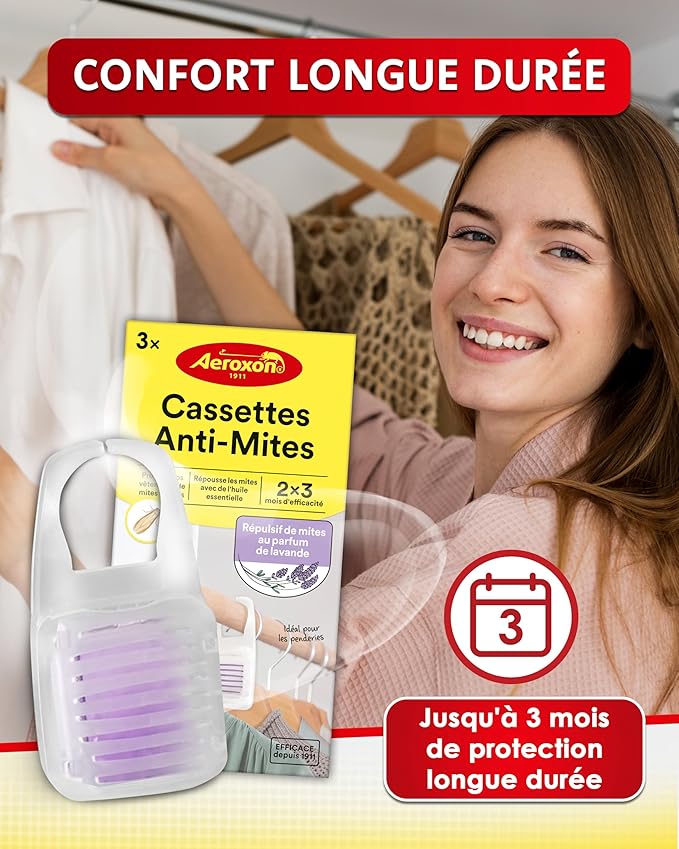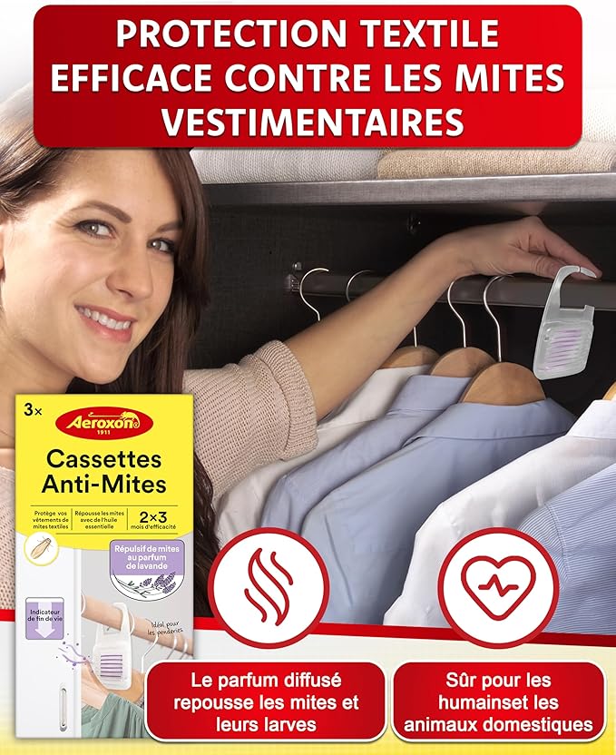 Les protections anti-mites textile Aeroxon assurent une défense efficace et durable contre les mites des vêtements dans les armoires et rangements textiles.