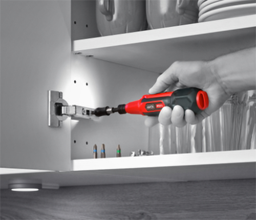 Coffret comprenant un tournevis à batterie avec embouts, faible encombrement grâce à sa forme en cale, idéal pour des espaces de travail exigus inaccessibles avec un grand outil.