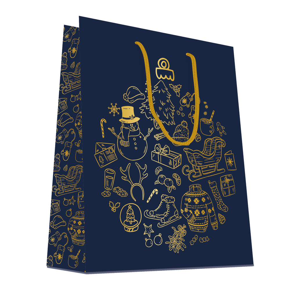 Sac cabas poignées cordelières imprimé avec des motifs de Noël en dorure à chaud.