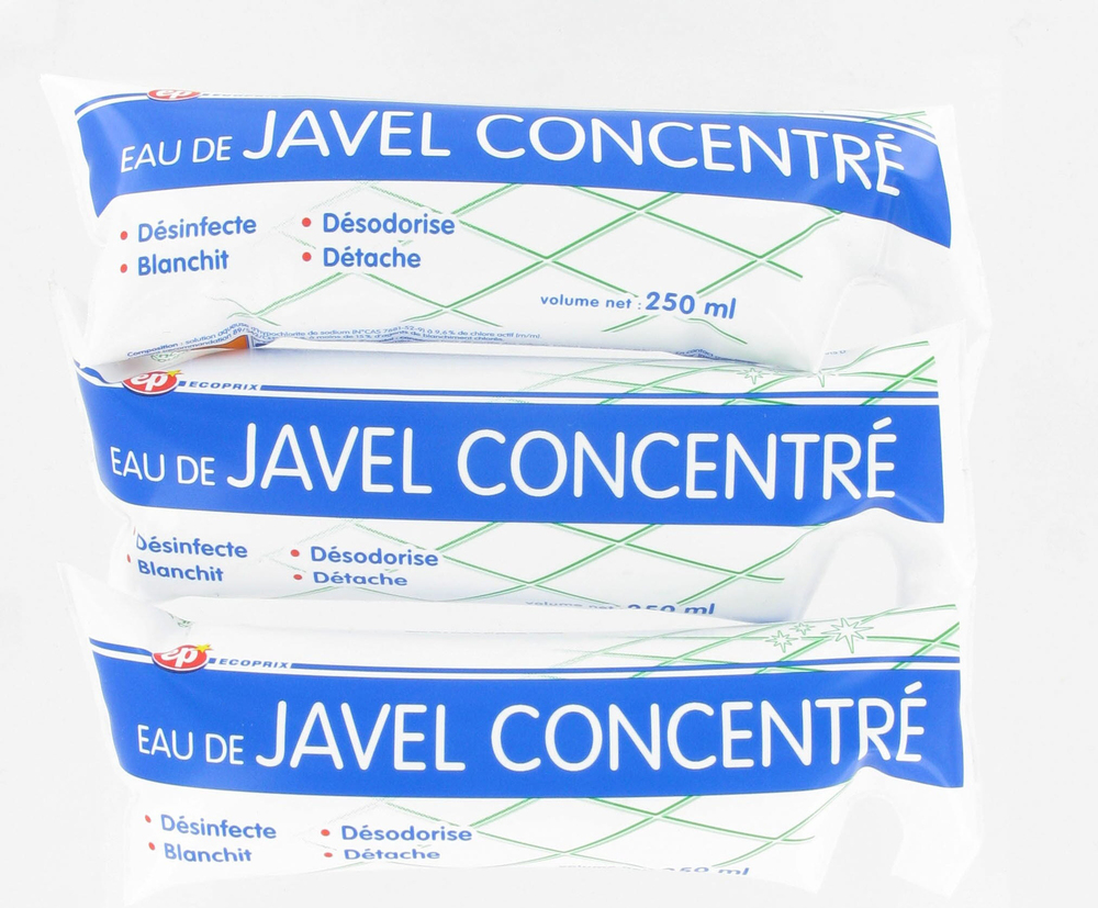 Eau de Javel concentrée à 4.8% de chlore actif avec un format en dose de 250 ml.