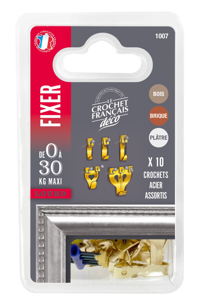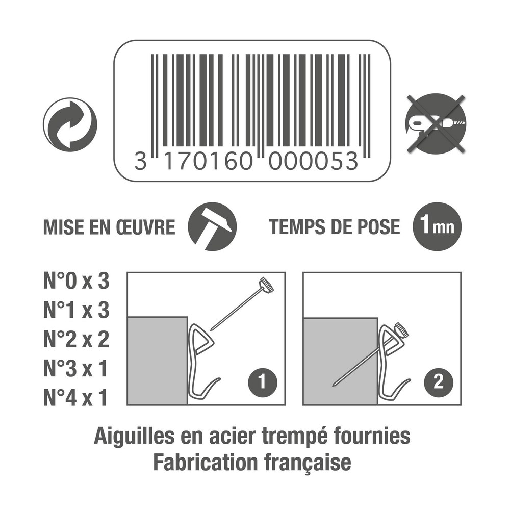 vous permet de fixer aisément tableaux et cadres des plus légers aux plus lourds. Des pointes en acier trempé pour les fixer : une résistance optimum qui convient parfaitement aux supports tels que le bois, les plaques ou carreaux de plâtre, béton cellulaire et les briques creuses.