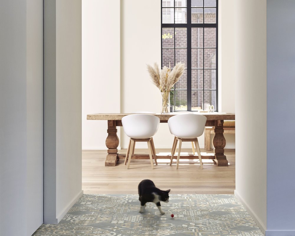 Ce sol PVC imitation carreau de ciment coloris grisé est le parfait allié pour une déco tendance.